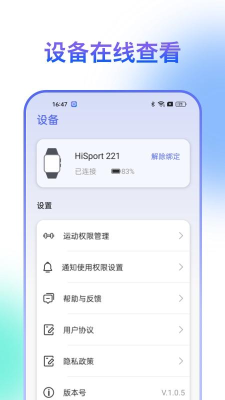 HiSportPro app是一款智能手表手机配套软件,软件可以帮助用户手机一键连接智能手表,实现运动步数统计,设备在线查看等功能,并且软件还拥有丰富管理功能,可以帮助用户更好的使用智能手表,开启健康智慧生活。