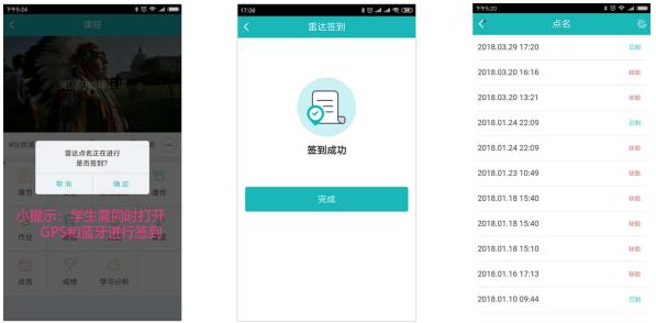 1. 点名开始若收到雷达点名签到通知,需打开手机网络、GPS 和蓝牙,点击「确定」