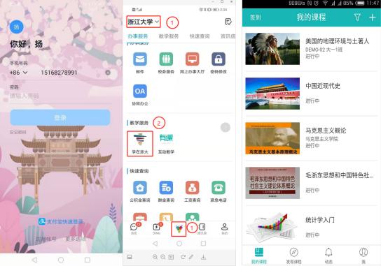 打开手机“浙大钉”,进入浙江大学工作台,选择“学在浙大”应用,进入正在上课的课程,进行点名签到。