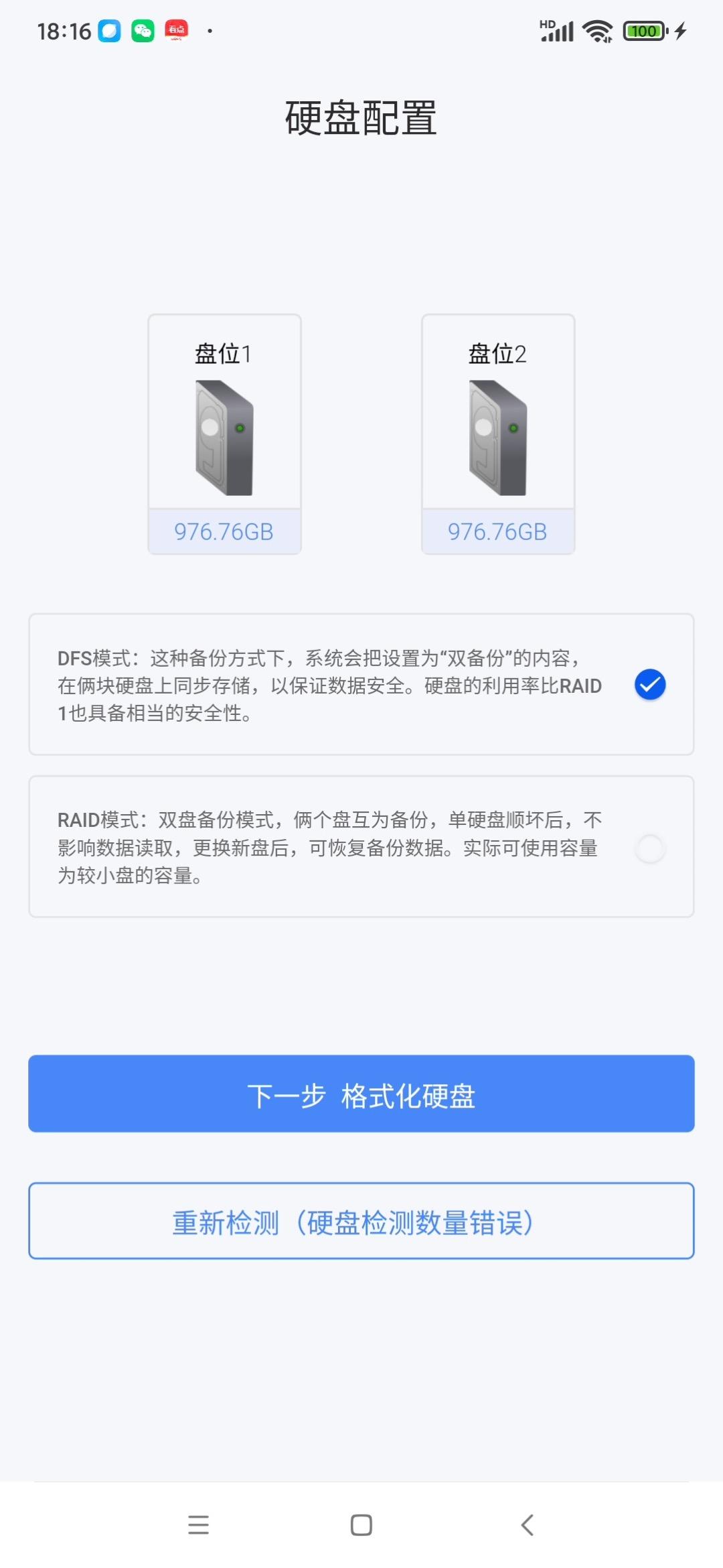 硬盘需要格式化才能正常使用,格式化会清除硬盘上原来存储的所有数据,请务必知晓。 APP默认DFS双备份模式。该模式下你可以自主选择哪些重要数据进行“双备份”以保障数据安全。 DFS相比RAID1模式的全量双备份,既满足重要数据的安全需求,又能让硬盘使用率最大化。
