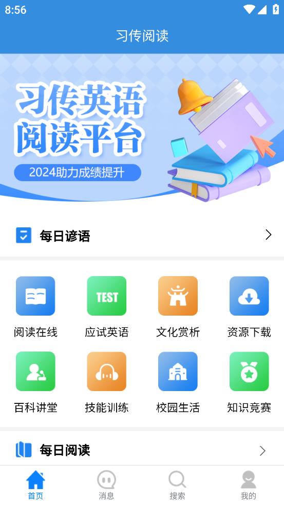 习传阅读app是四川习传文化传播有限公司倾情推出的一款专业的英语教育平台,平台拥有在线阅读,听力锻炼,资讯技巧,在线试题等等功能板块,可以帮助用户更好的英语学习,进修,研究等,习传阅读,中西融通, 以文化人,欢迎前来下载使用。