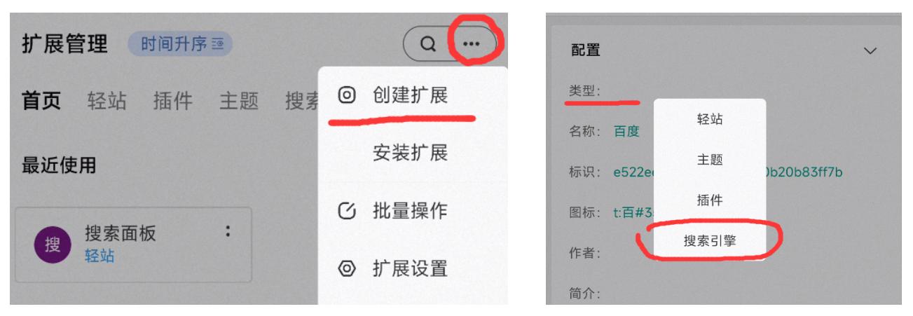 如图,和创建其他扩展一样的创建方法,类型中选择搜索引擎。