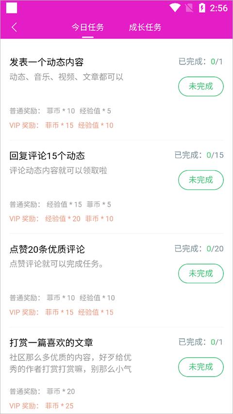 4、不过还有一些“成长任务”,这里的获得就能够获得菲币数量比较多哦。