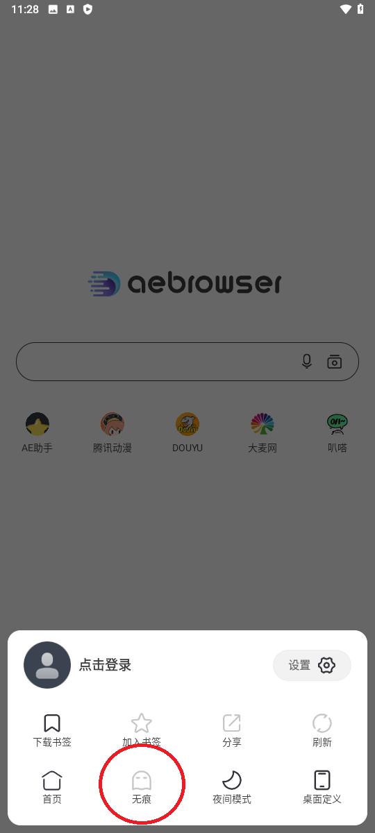3、看到屏幕下方显示已开启无痕模式即可