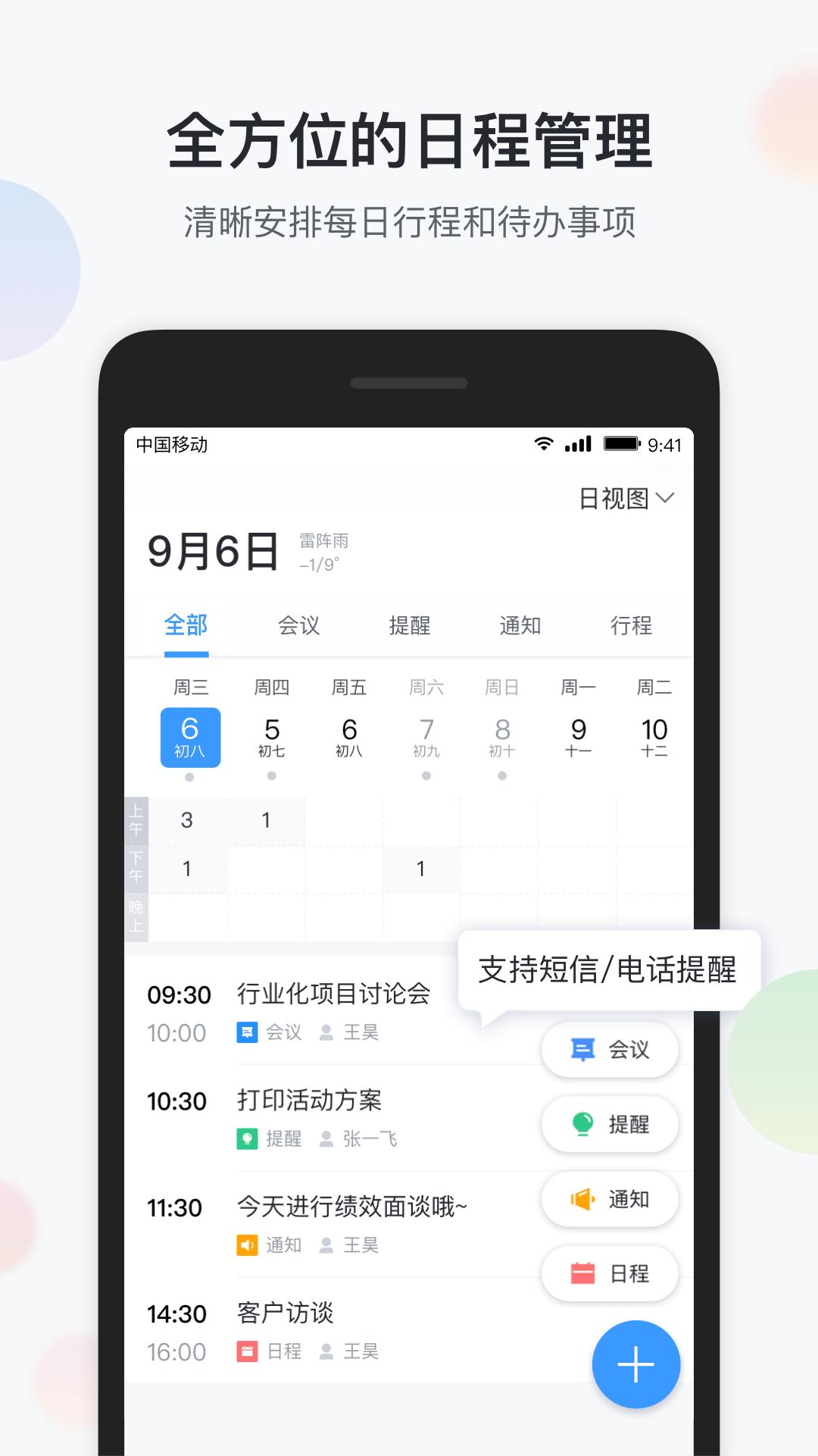 【日程】支持会议邀请、个人提醒、团队通知和事项通知,重要待办多重提醒不遗漏。
