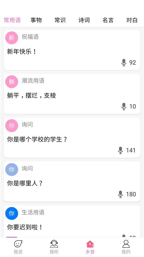 疯狂方言app是一款地区方言翻译软件,提供各个地区的方言翻译功能,可以选择普通话翻译成为任意的方言,快速了解方言的发音,了解方言的信息;软件设置有我听、学习、发现和休闲四个专区板块,在我听页面提供有很多有趣的方言视频,可以播放视频观看,有趣好友的影视方言配音,可以提供很多的娱乐;不仅提供影视作品方言,还有广播、人文、历史、诗歌、戏曲等各种各样的方言视频,实时在线观看非常有趣,丰富你的生活;同时还可以咋西安学习方言,提供各个地区的方言语音,随时播放学习,学习方言非常简单。