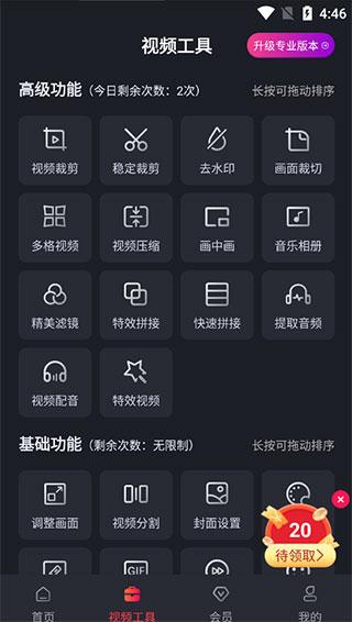 3、视频工具页面,分为高级功能、基础功能,高级功能是需要付费的