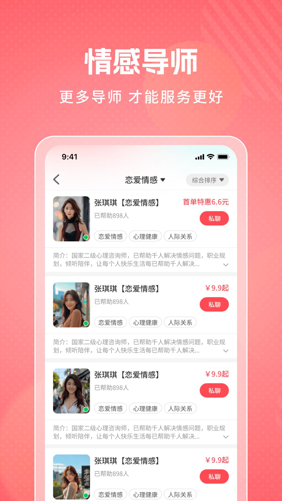 【心理咨询】一键预约专家,一对一私人专属咨询心理健康、婚恋情感、情绪压力、人际关系、亲子教育、职场压力、个人成长等各类问题,线上线下多种选择,帮助用户解决生活困扰。