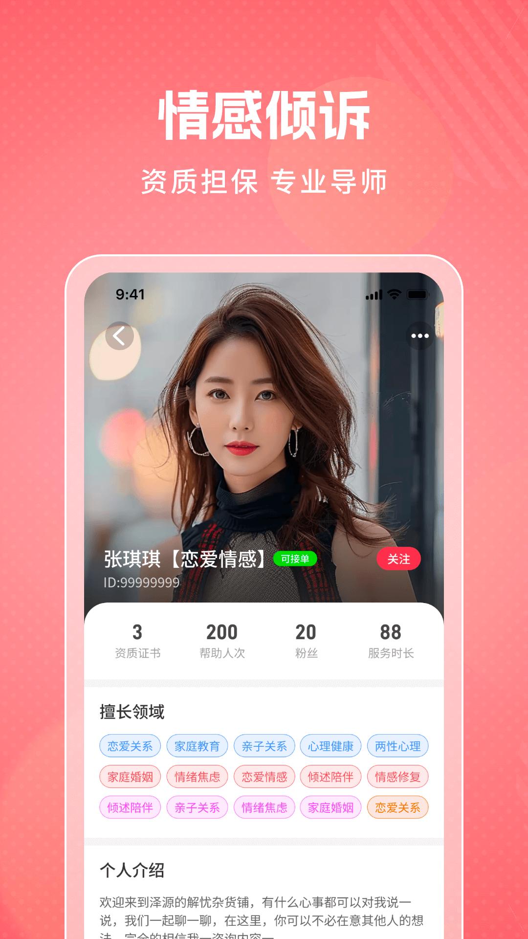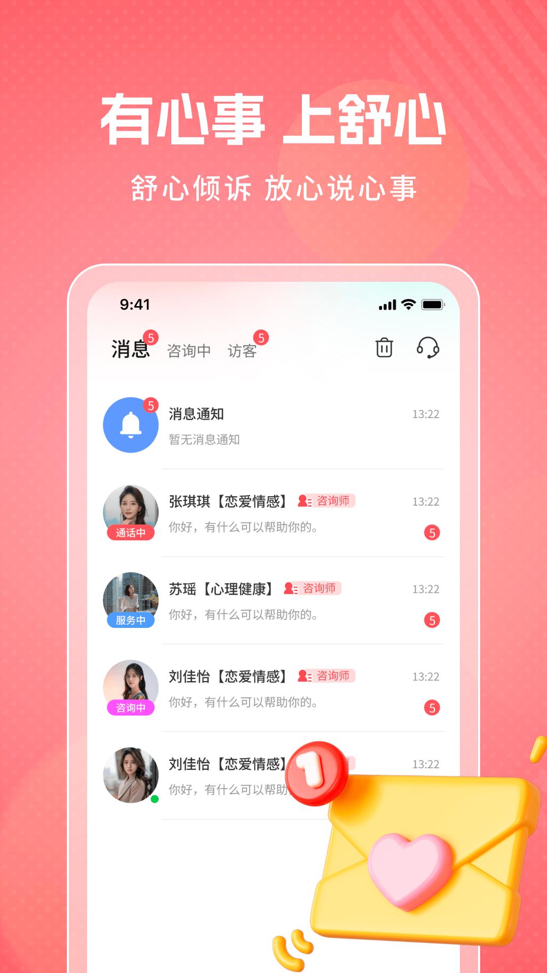舒心倾诉心理咨询APP是一款专业的心理健康辅导工具,致力于为用户提供便捷、专业、私密的心理健康服务。平台汇聚上万名资深心理专家、情感专家、亲子教育专家、婚姻家庭专家等全领域专业心理咨询师,