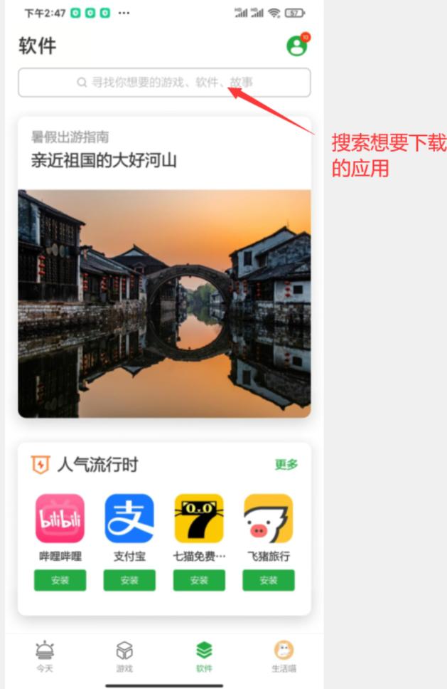 1、首先,在豌豆荚首页搜索框搜索您想要下载的应用