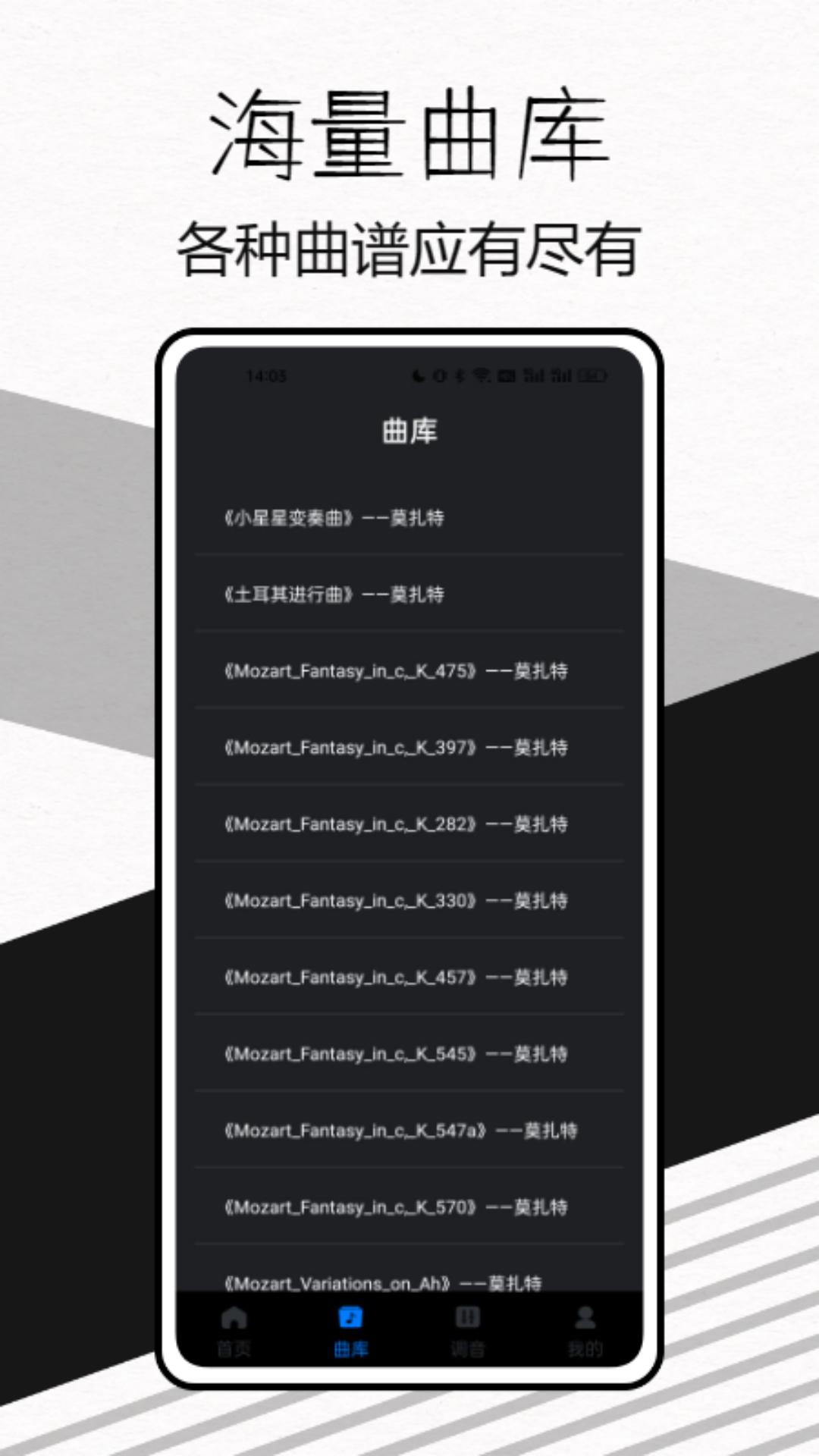 该应用主界面展示了一个简易风格的节拍器,用户可以轻松调节奏间隔,满足不同曲目的节拍需求。此外,它还提供了一个丰富的曲谱界面,内含众多曲谱供用户参考和学习,让您随时随地沉浸在音乐的海洋中。