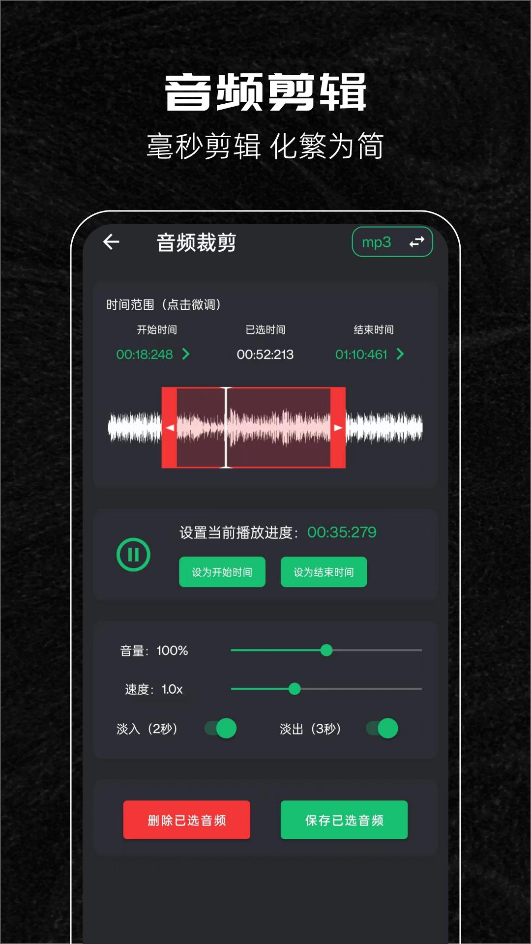 1、 音频剪切:本地音乐库,自定义音频裁剪范围,剪出你要的特别精彩;