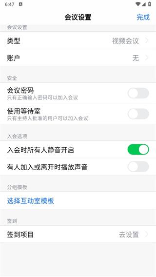 3、接着来到会议设置的页面添=设置会议密码,会议类型,添加会议所需文件等信息后点击右上角的【完成】;