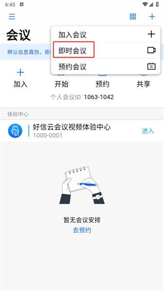 1、首先我们打开好信云会议软件,点击右上角的【加号图标】-【即时会议】;