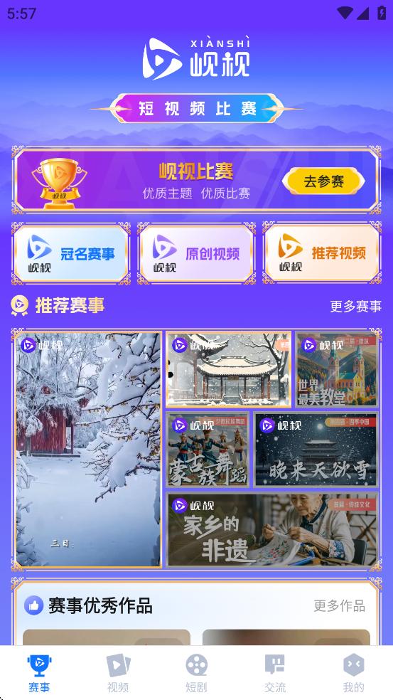 岘视app是一款比赛类短视频社交软件,软件拥有赛事,视频,短剧,交流,我的等等板块,用户可以在这里看短视频,看短剧,还可以互动交流,分享生活,岘视可以给予用户不一样的短视频使用体验,来岘视,发现世界之美。
