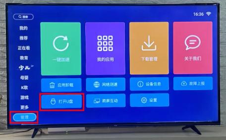 5、由于TCL电视系统的限制,下载好的不会自动安装,需要到【欢视助手】的【管理】里打开【打开U盘】按钮