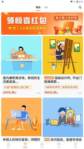 2、进入到精选,在这里有很多无需出门就可以工作的兼职,闲暇时期也可以赚钱;