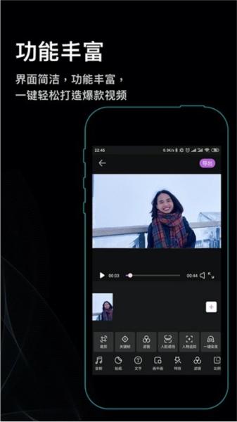 1、专为视频编辑用户需求定制的应用,丰富的功能和元素素材都能满足你,剪辑后也支持预览查看效果;