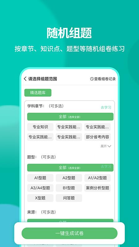 3、随机组题,各种试题中抽取题型组成试卷进行练习,随时定制准时真题题单;