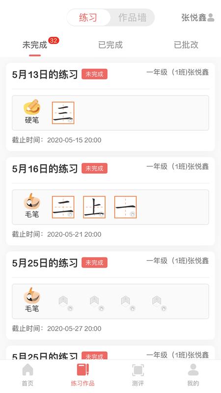 2、提供书法练习上传功能,可以了解进度和批改结果。