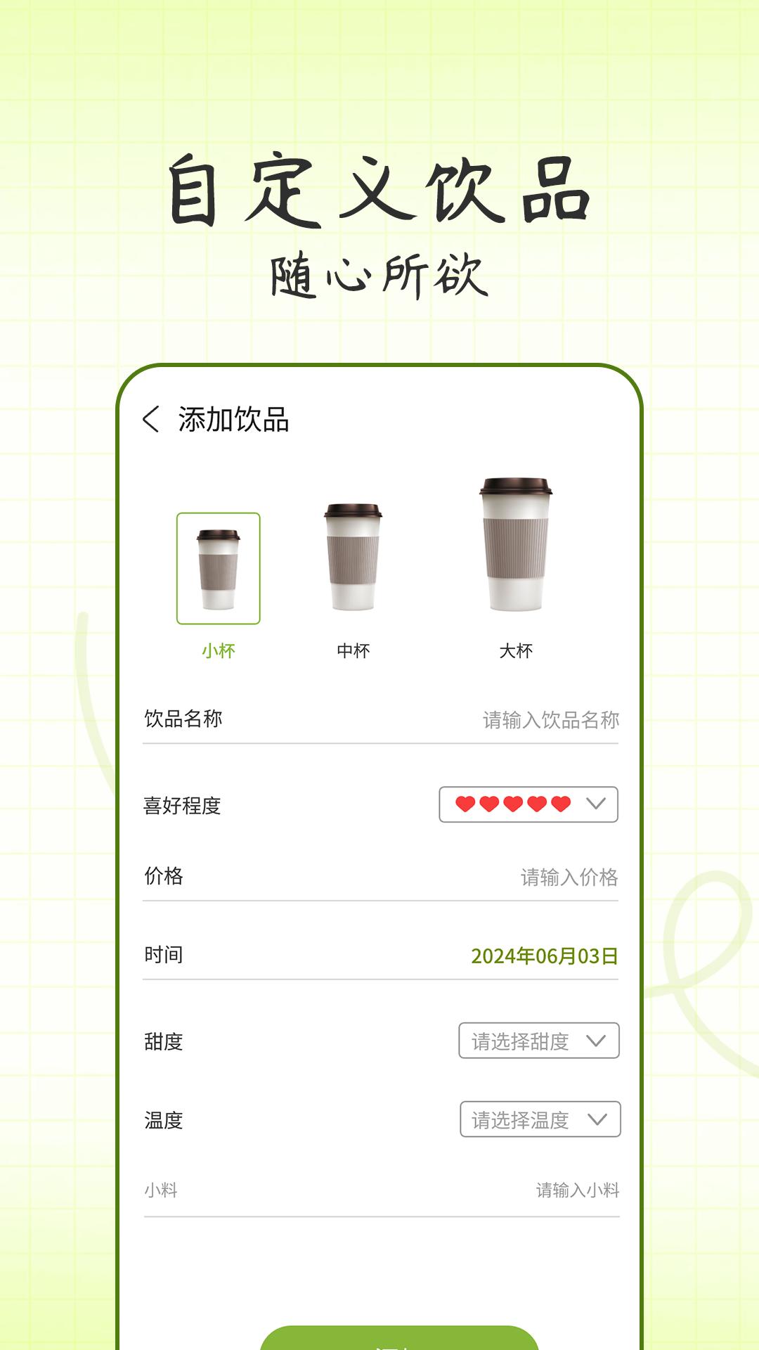 -自定义饮品:轻松记录您喜爱的饮品,可自定义名称、品牌、口味等信息,让您的记录更个性化。