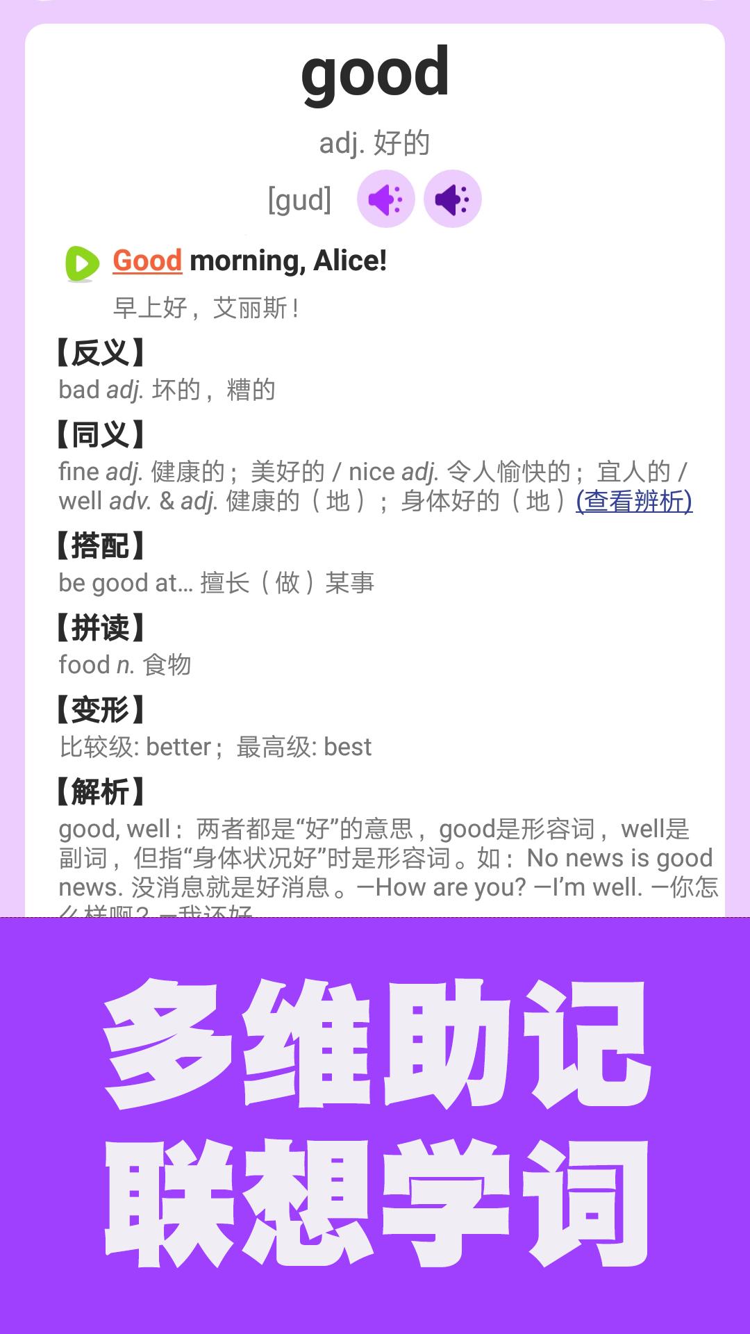 “初中英语单词通”同步初中英语全国各套教材,通过图解趣学、手语视频,单词带读,游戏过关,趣味听写,交互练习等多维度记忆方式,帮助广大中学生轻松快乐高效背单词!