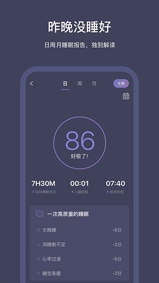 而且软件还有不错的促眠功能,帮助用户快速入睡。而且软件界面非常简洁,会将各种不同的数据展现的非常详细,也能让用户对自己的身体健康有更好的掌握,有一定的参考价值,