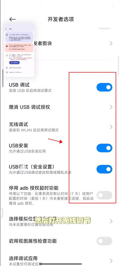 4、在选项当中将下图中的开关设置成如图一样,然后点击无线调试。