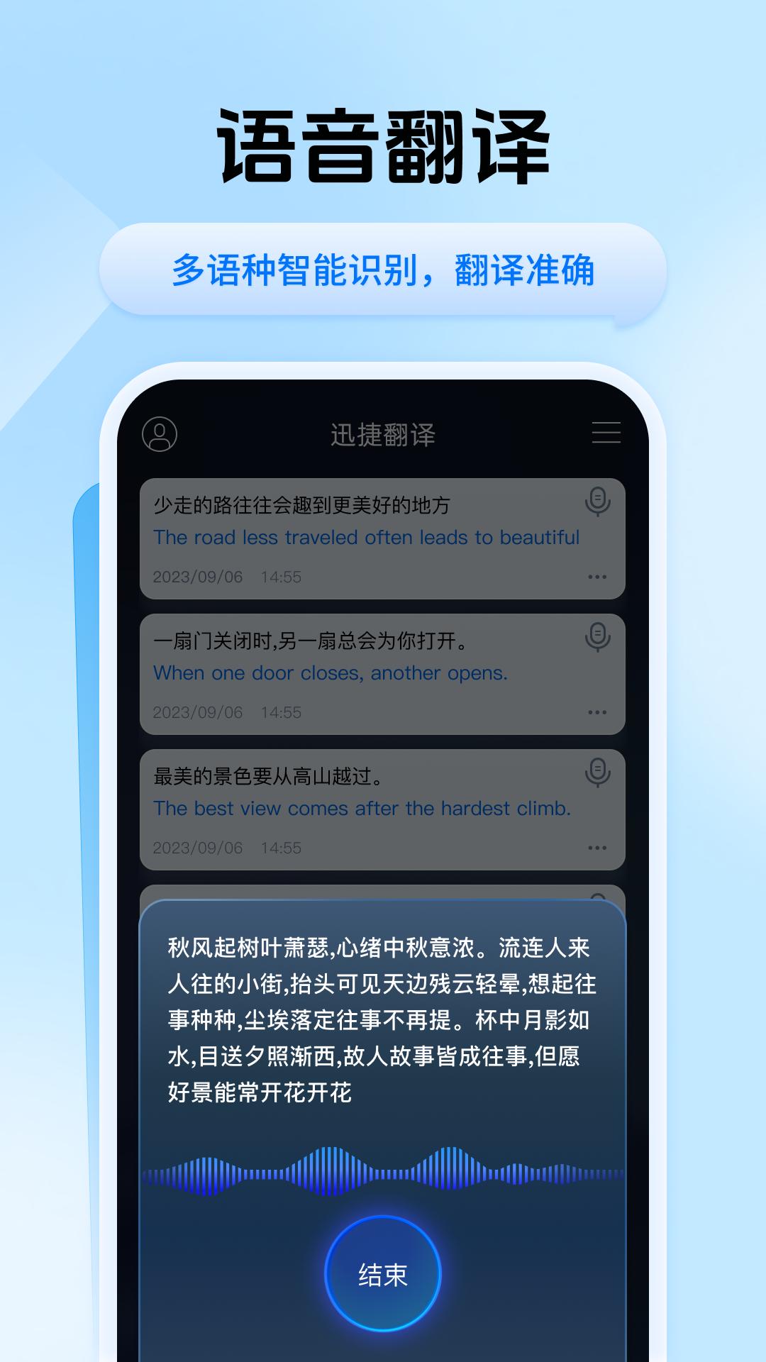 欢迎使用迅捷翻译,一款功能强大的安卓应用,为您提供快速、准确的语音翻译、同声传译、拍照翻译、文档翻译和文字翻译服务。