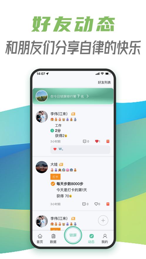 3、好友排名,在锁屏积累、测评答题过程中,可以同好友共同锁屏竞争,排名展示,对好友的自律也可以进行点赞、鼓励,甚至金币打赏,让用户将自己想展示的自律成果在的朋友圈里共享得更为容易。