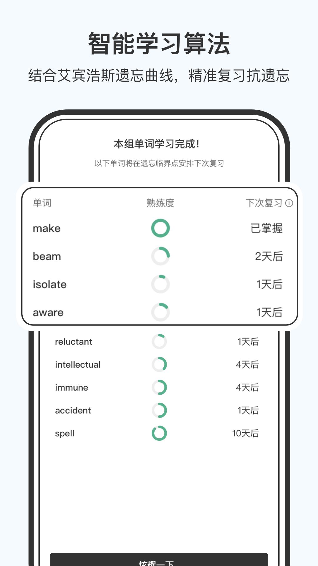 依据熟悉度反馈,动态调整复习,高效背词