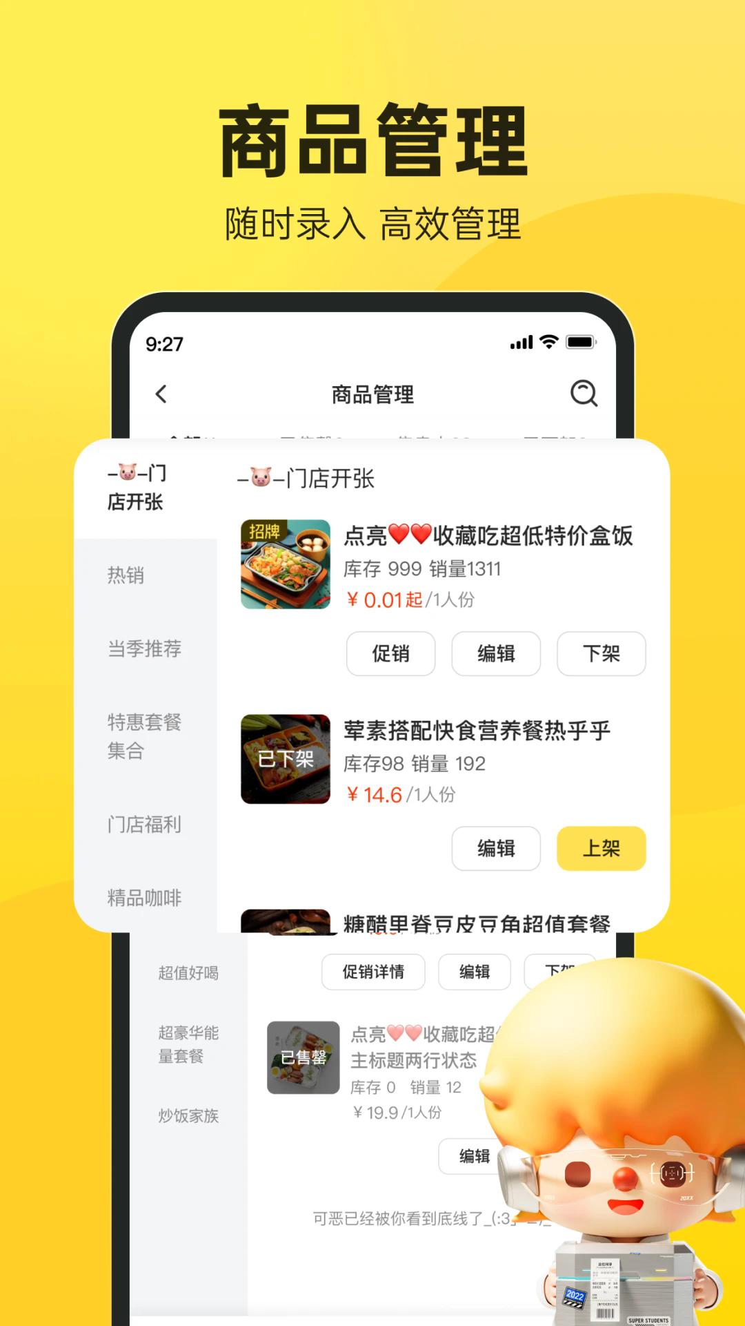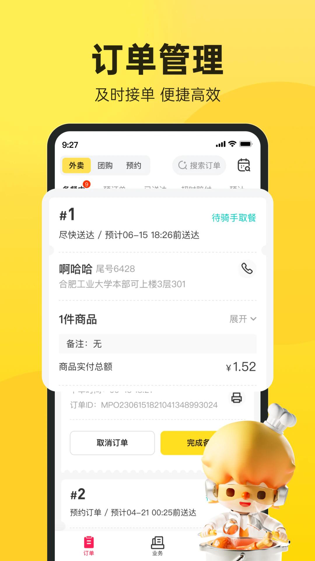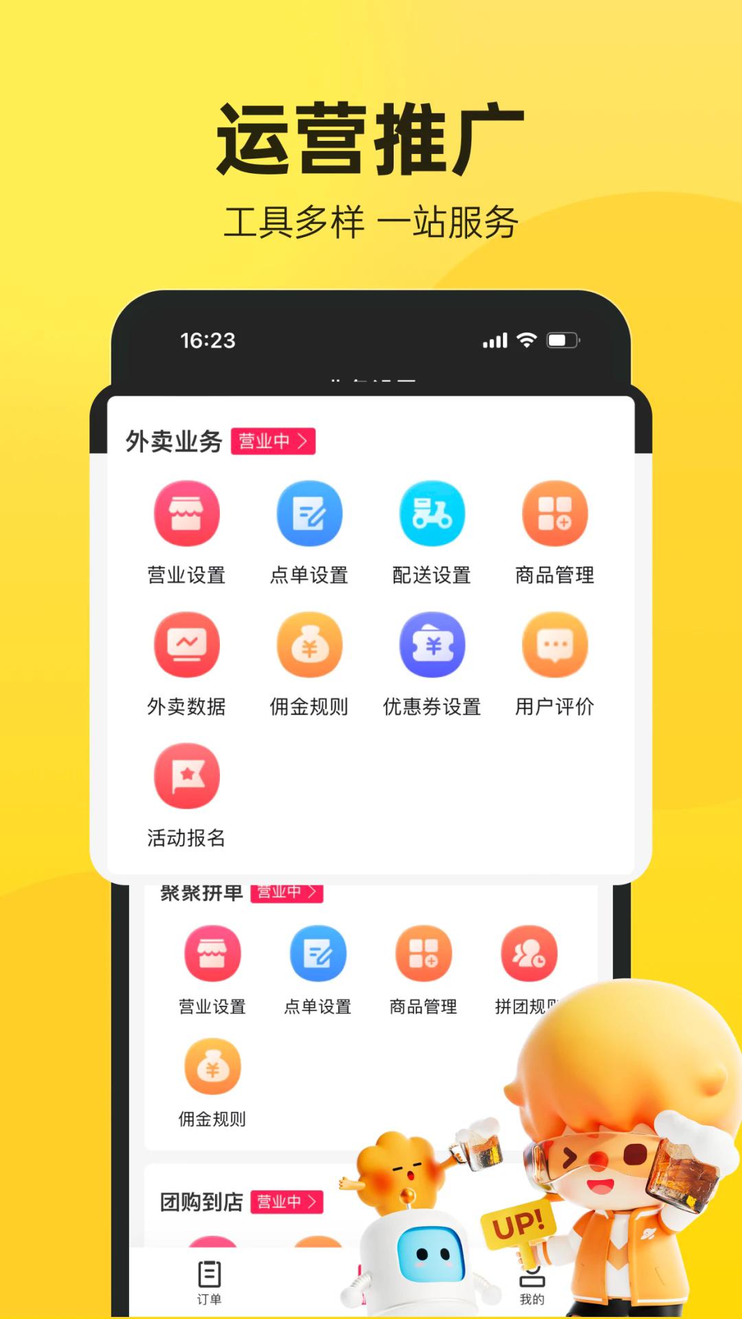 商家可以通过App完成订单管理、商品管理、活动管理、营业信息管理、账户管理等功能,简洁明了,轻松上手。