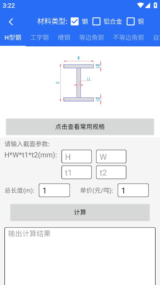 可自由输入各种类型钢材的截面参数,如H型钢可输入宽、高、壁厚等参数,计算出材料的截面面积、每米外表面积、线重等结果,还可以输入材料的长度、单价的参数,计算出总表面积、总重量、总价格等结果。