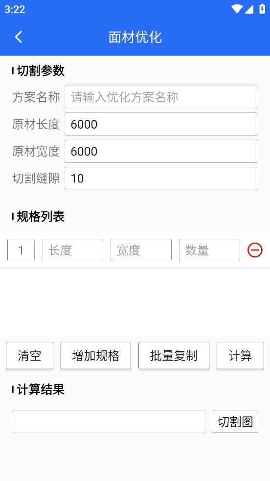面材切割套裁优化功能,可根据设定的原板尺寸、切割料缝宽度,需要切割成的目标数据,得出相对优的切割方案,并出具切割示意图,用以指导原板切割,减少浪费。