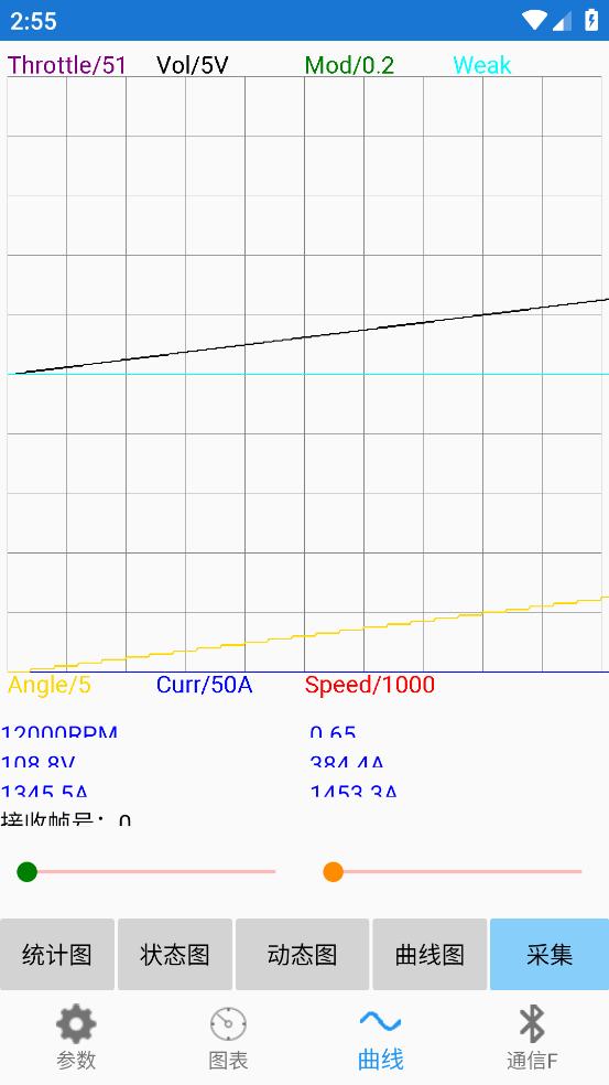 本手机软件能够方便快捷地监视电机转速,电池电压,电流,输出功率,工作状态,并对运行状态的所需要各种参数进行配置,并绘制工作曲线,实时了解电机工作特性,通过调试参数,使得电机工作在匹配优化状态。