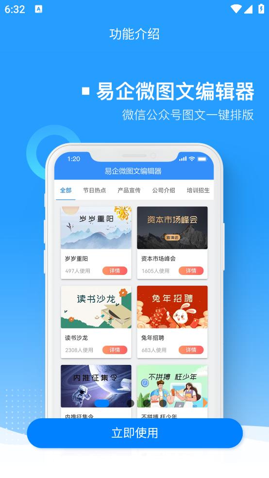 易企微公众号图文排版编辑器app是帮助需要为公众号的文字排版的办公软件,手机上的公众号文字排版比较特殊,但是也不负责,不过有一款由模版的编辑器可以节省用户很多时间,并且能让用户在这里一键式就可以出力文字排版的问题,让用户的公众号的排版能够更好看。