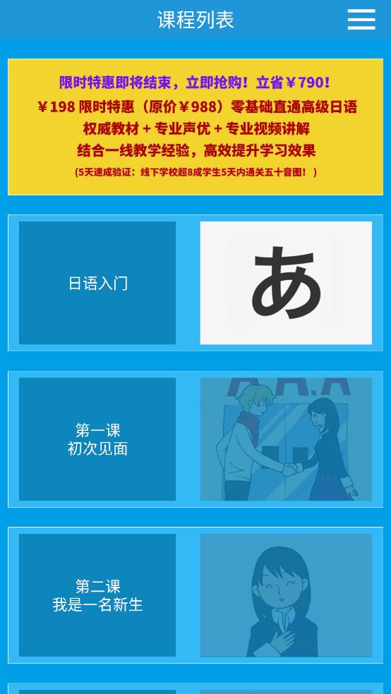用户能够通过课程来进行日语知识学习,参与教学课程来进行视频学习;