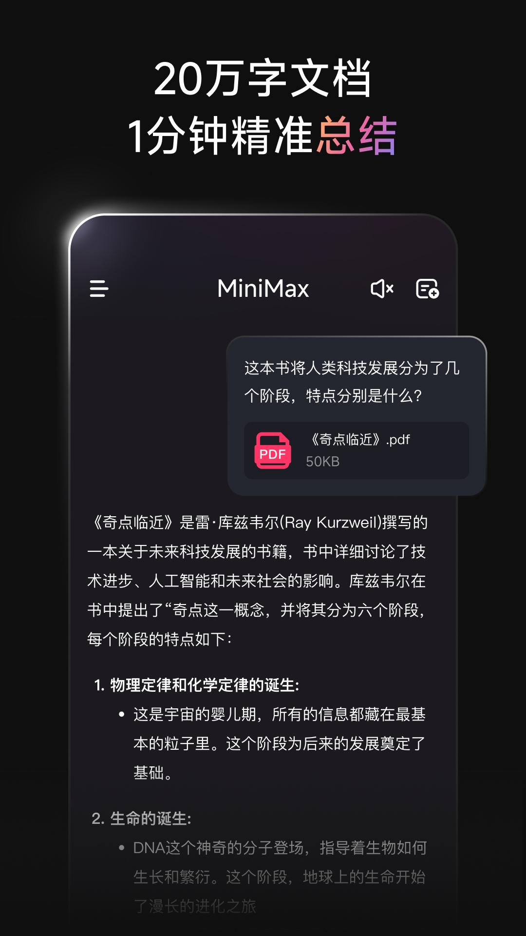 minimax手机版是上海稀宇科技有限公司倾情推出的智能助手,由海螺AI全新升级更名而来,软件拥有智能搜索,文件速读,语音通话,拍照答疑,创意写作,编程代码等等丰富功能,可以帮助用户更智慧高效学习工作生活,minimax,你的专业生产力助手。