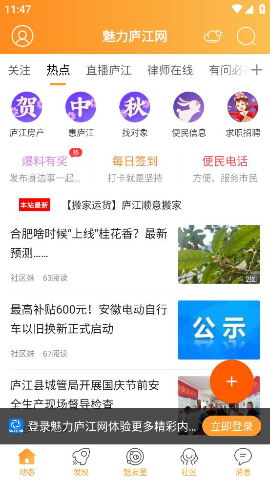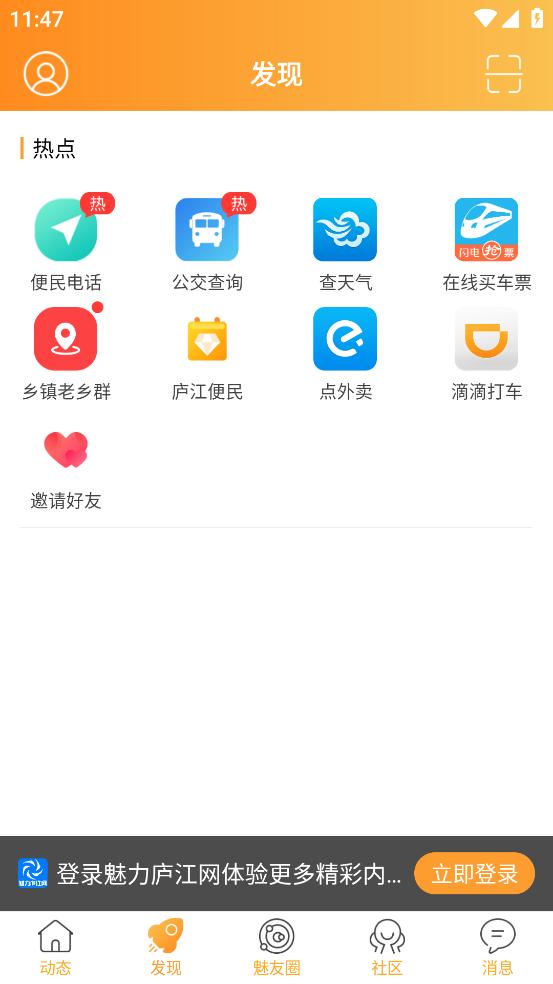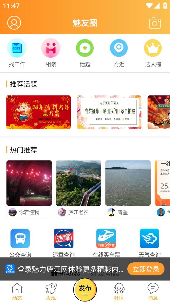 魅力庐江网app是专为庐江制作的一款本地社区服务平台,软件拥有动态,发现,魅友圈,社区,消息等等功能板块,可以给予用户更智慧有趣庐江生活体验。