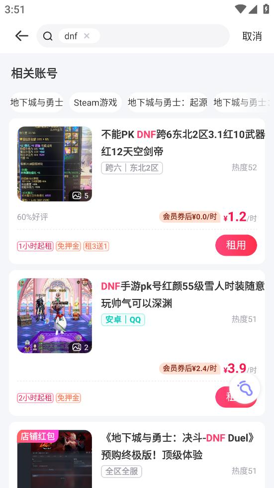 dnf租号玩app是一款租号平台,平台拥有海量dnf账号,玩家可以用超低价格畅享dnf极品号,让游戏玩耍更有乐趣,觉得不错的朋友可以下载看看。