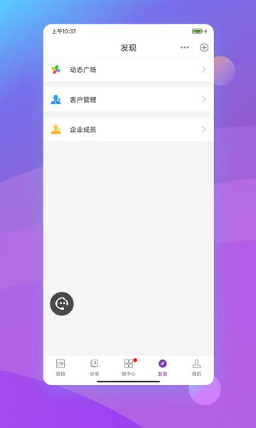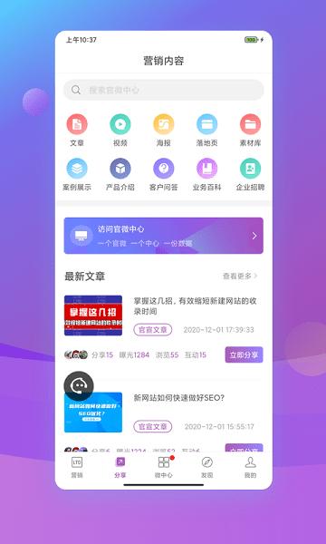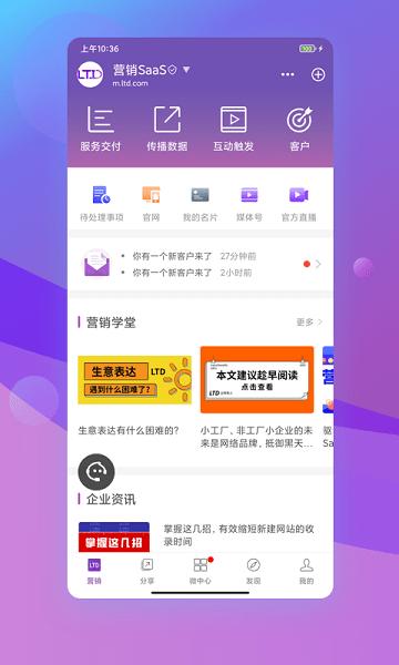 3、点击分享,查看各种类型的营销内容,快速对企业进行营销,在线回答客户各种问题