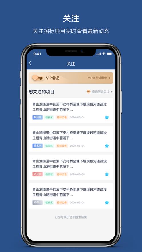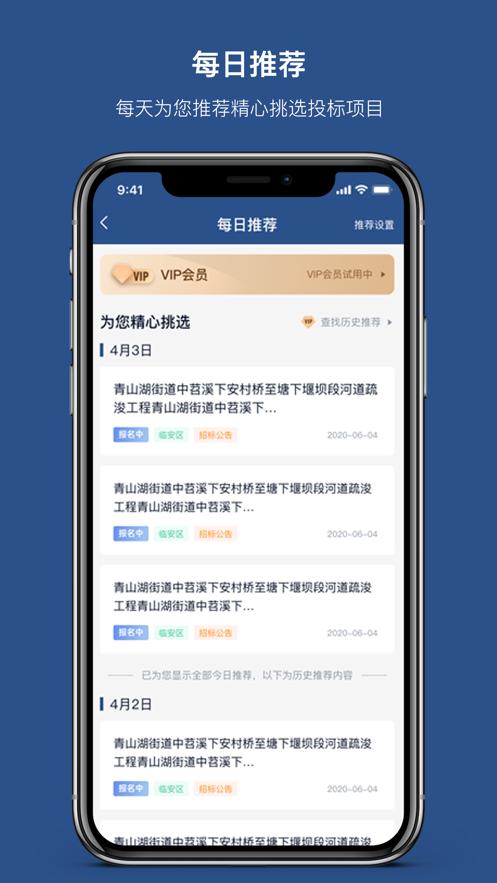 招必得是一款提供招标项目公告查询、专属定制每日推送、独家招标项目线上报名、开评标视频直播等功能的电子招投标业务综合服务平台。