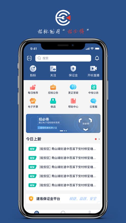 招必得app是建易招标采购平台,平台拥有投标,关注,保证金,开标直播,每日推荐,今日待办,电子开票,投标保险等等丰富功能,可以助力用户更智慧招投标。