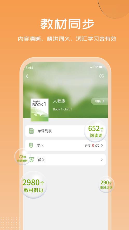 同步教学进度、教材预习,课堂更轻松,精选练习、作业、老师推荐,学习有的放矢,词汇分级、话题学习,备考轻松