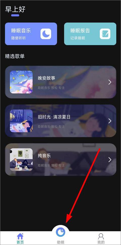 1、打开睡眠记录,进入首页,首页有睡眠音乐、睡眠报告、精选歌单等版块,点击助眠;