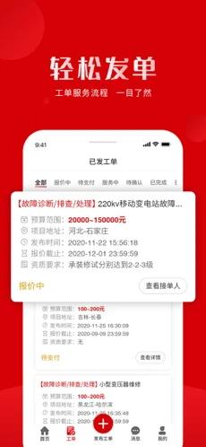 1、自动保存已发工单的信息,并按照报价中、待支付、服务中、待确认等分类进行展示;