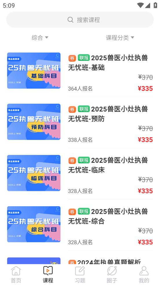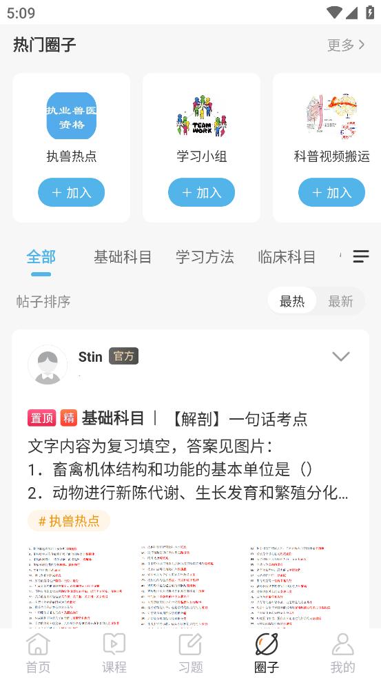 兽医小灶app下载安装是一款执业兽医资格考试备考助手,软件拥有首页,课程,习题,圈子,我的等功能板块,可以助力用户更轻松备考学习拿证。
