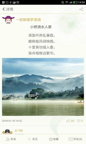 -原创诗词(古诗、古诗词)发布赏评:“以诗会友”板块就给尝试或者爱好诗词(古诗、古诗词)创作的朋友们提供了一片诗绪飞扬、长谈阔论的天地。你可以在“我的诗集”发布自己的原创诗词,并在“以诗会友”中可以看到所有公开的原创诗词,当点开某首诗词(古诗、古诗词)时,可以看到诗词(古诗、古诗词)的具体内容,下方还有加好友、加关注、收藏、评论四个功能。