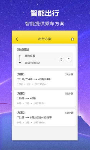 2.换乘路线:选择起始站点与目的地车站,将自动为您算出最优公交换乘方案,坐哪辆车直达,换乘公交怎么转,在哪一站换乘最方便,坐几路车步行距离最短等