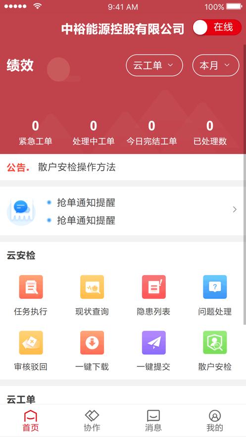 客服外勤app是一款外勤工作助手,软件拥有首页,协作,消息,我的等功能板块,包含云安检,云工单等,可以帮助用户更智慧外勤工作,需要的朋友欢迎前来下载使用。